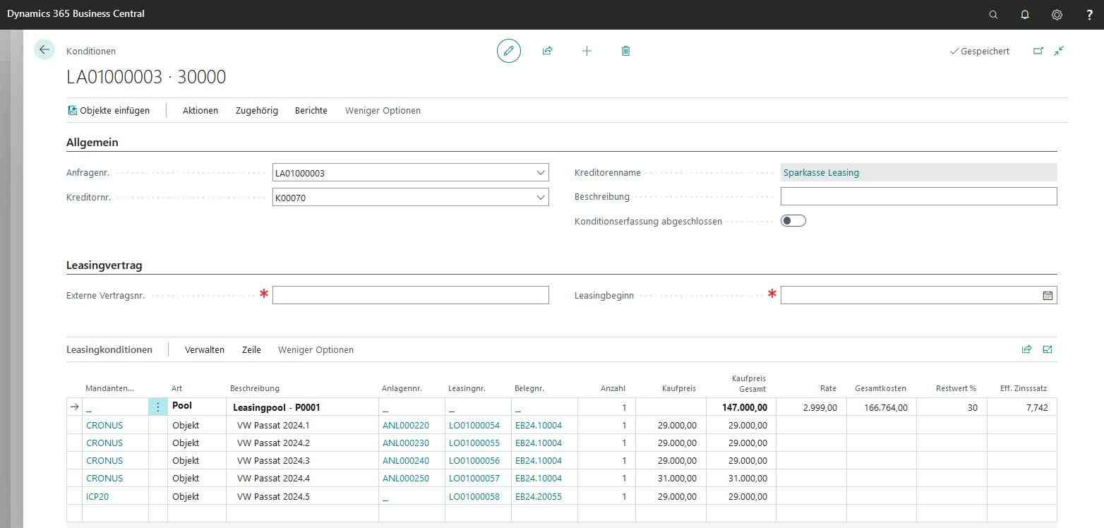 Insbesondere für größere Unternehmen ist es von entscheidender Bedeutung, dass der Leasingprozess ganzheitlich im ERP-System Business Central abgebildet wird. Unser Modul bringt nicht nur die Verwaltung von Leasinggegenständen und die effiziente Nutzung in kreditorischen und debitorischen Verträgen zusammen, sondern bietet auch eine integrierte Plattform zur Erfassung von Leasing-Preisanfragen und Konditionsvergleichen. Der Prozess der Zusammenfassung von Leasinggütern zu Pools und die Erzeugung von Leasinggütern aus Anfragen werden durch das Modul vereinfacht. Mit einem leistungsstarken Leasingrechner erfolgt die präzise Berechnung von Leasingraten und effektiven Zinssätzen. Somit ist eine transparente und durchgängige Dokumentation vom Leasingangebot bis zur Abrechnung gewährleistet. Machen Sie sich bereit für eine innovative Zukunft der Leasingverwaltung in Microsoft Business Central!
