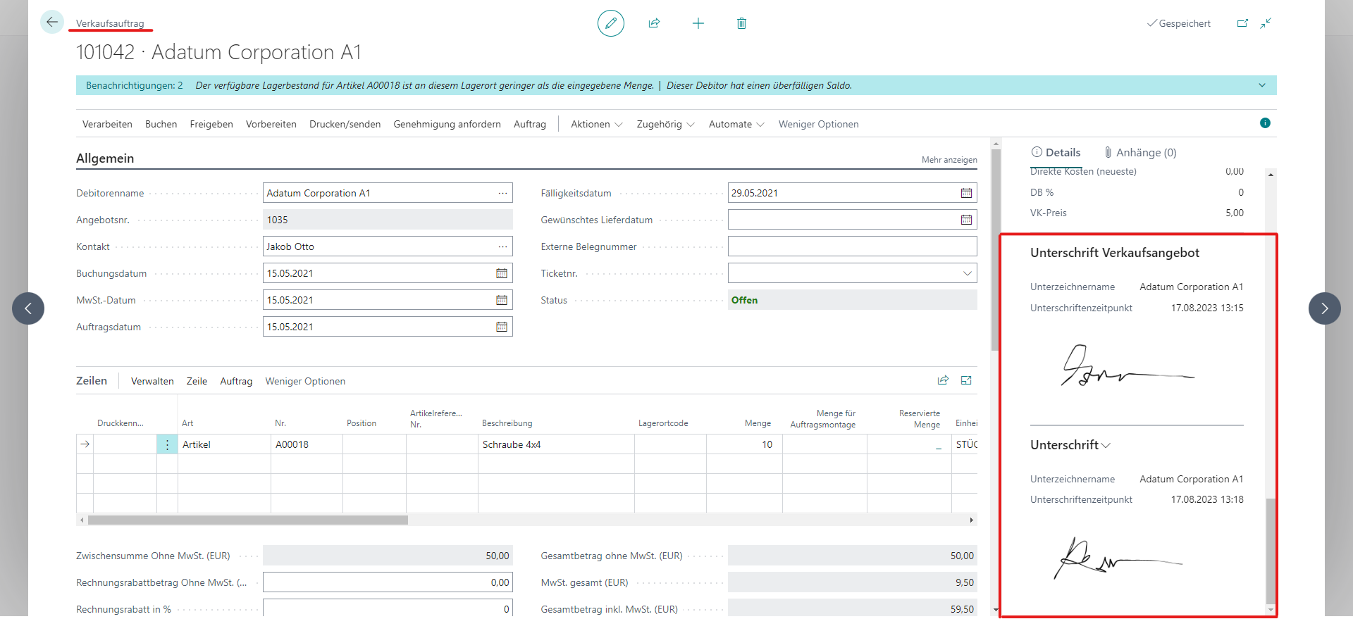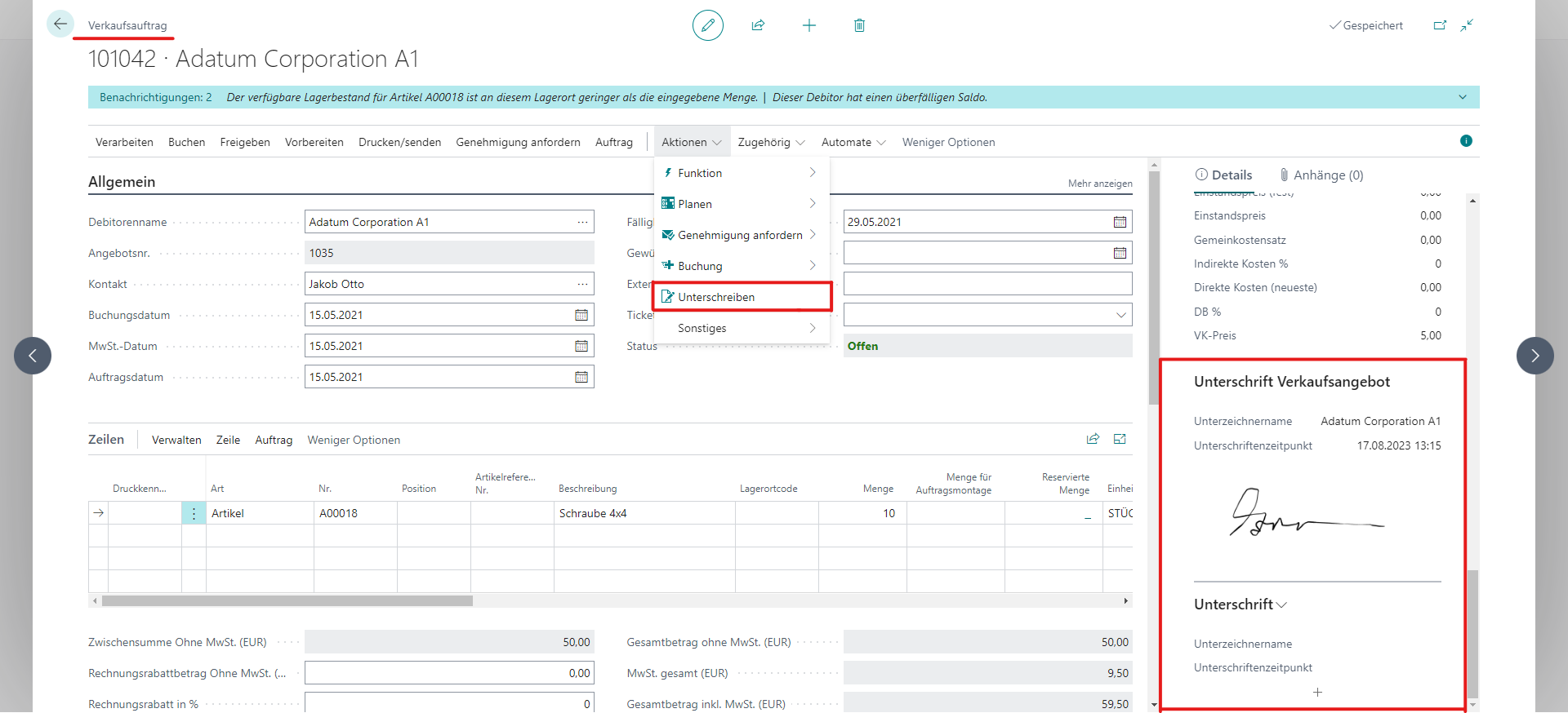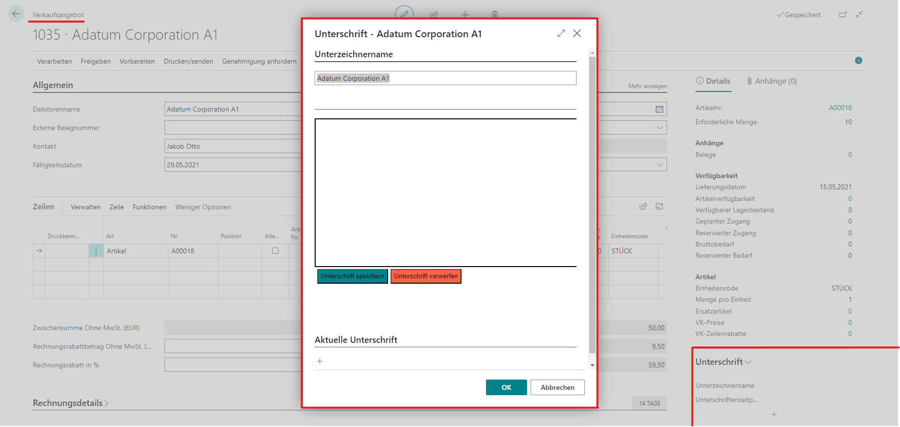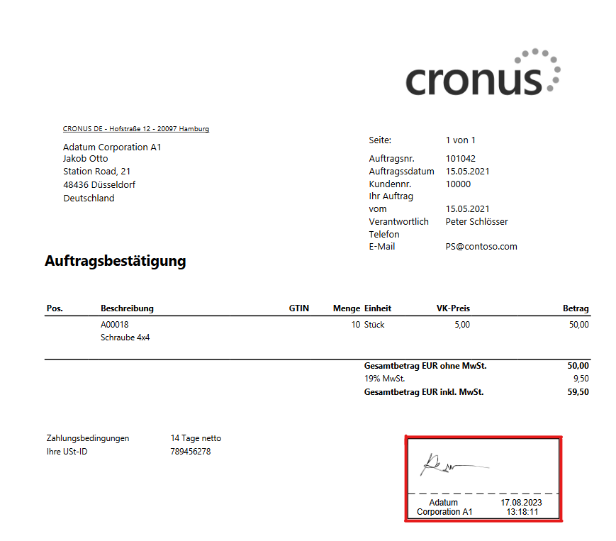 - Unterschreiben Sie in den Masken, sowie in den Belegen von Business Central.
