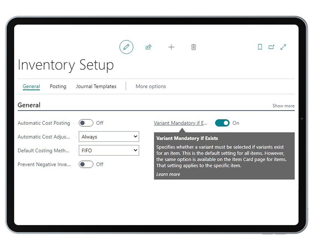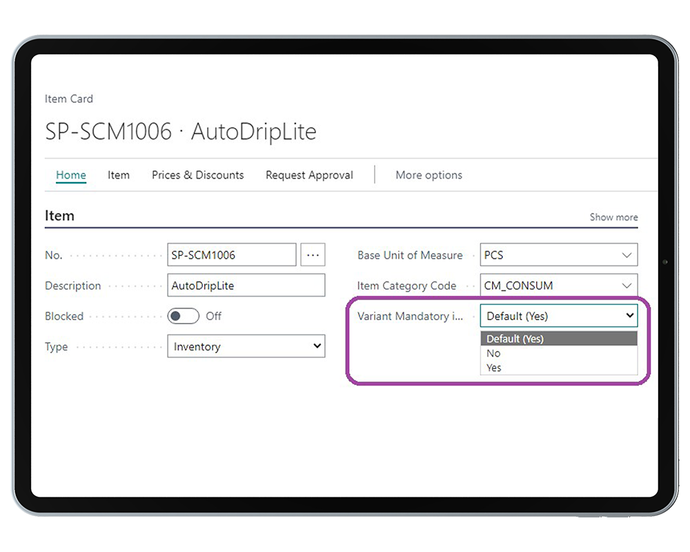 Alle Kunden, die mit Artikelvarianten arbeiten, können in der neuen Business-Central Version entweder global in der Einrichtung oder je Artikel definieren, ob Artikel nur mit Varianten oder auch ohne verwendet werden dürfen. Mit dieser Einstellung kann sichergestellt werden, dass ein Varianten-Artikel nicht ohne Variante gebucht wird und damit Fehler in der Bestandsführung entstehen.